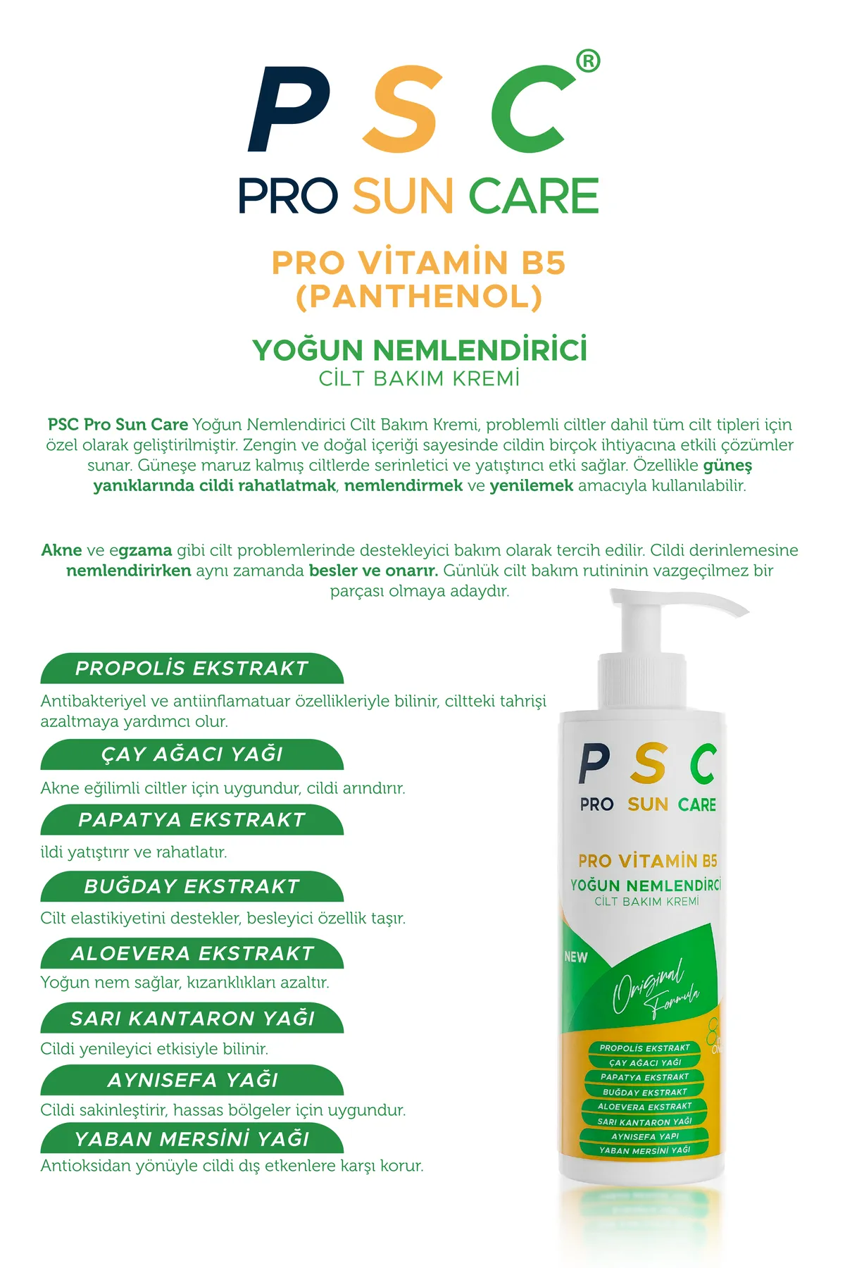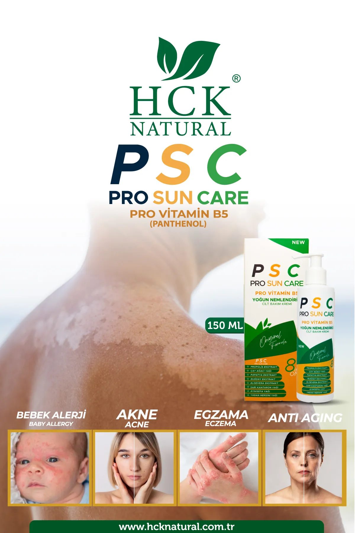 PSC Pro Sun Care, cildinizi yoğun nemlendiren ve dış etkenlere karşı koruma sağlayan bir formüldür. Propolis ekstraktı, çay ağacı yağı, papatya ve aloe vera gibi doğal bileşenlerle zenginleştirilmiştir. Günlük cilt bakım rutininiz için mükemmel bir tamamlayıcıdır.