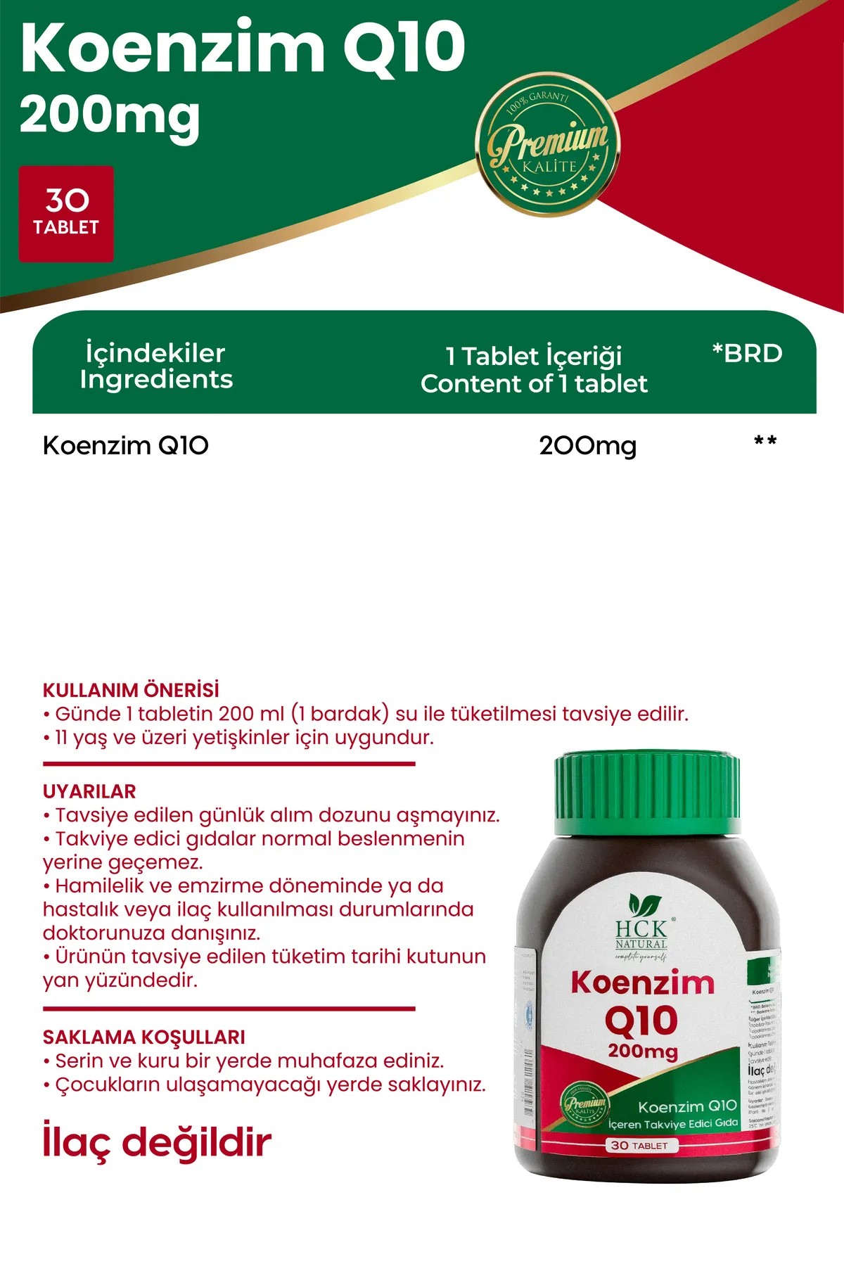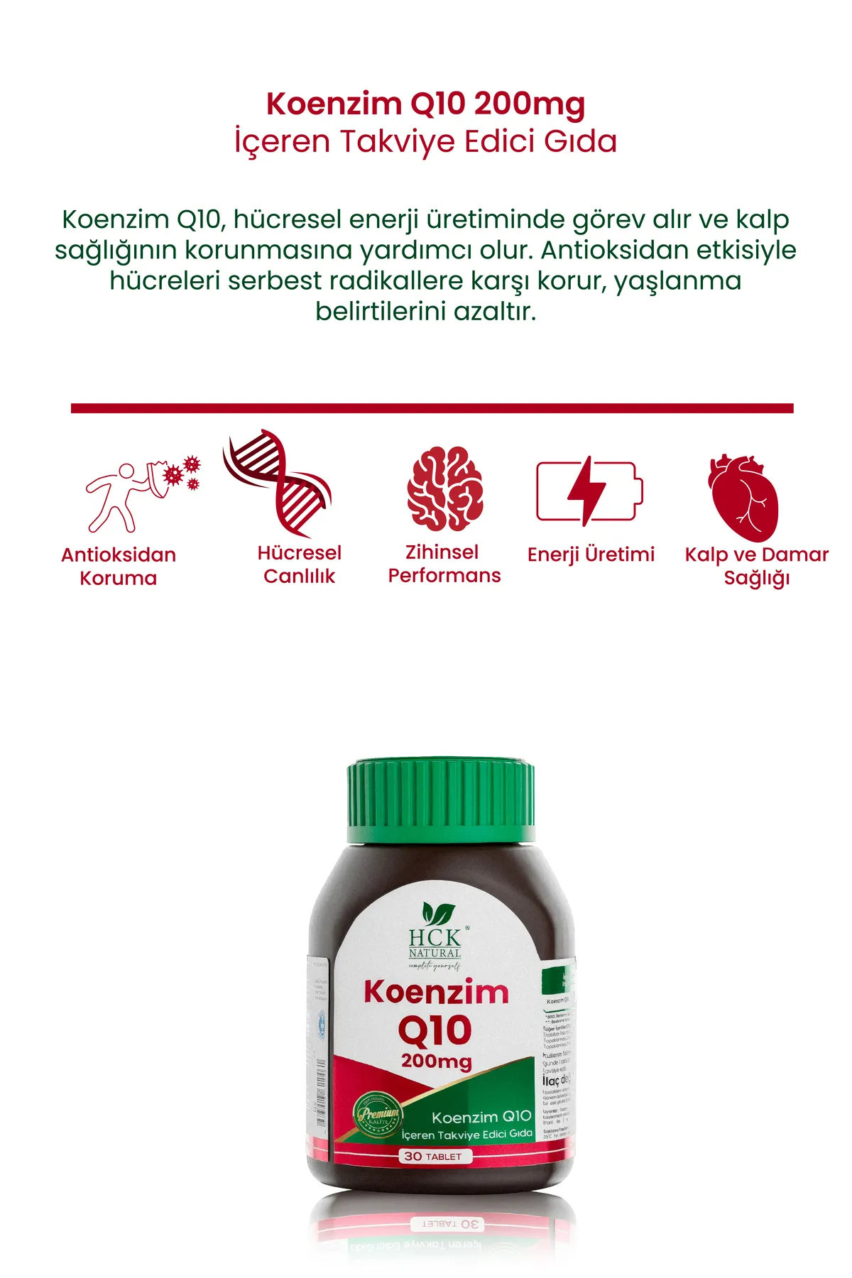 HCK Natural Coenzyme Q10 200 mg, hücresel enerji üretimini destekleyen güçlü bir antioksidan kaynağıdır. CoQ10, kalp sağlığını korumaya, enerji seviyelerini artırmaya ve hücrelerin serbest radikallere karşı korunmasına yardımcı olur. Günlük yaşamda enerji dolu ve sağlıklı hissetmeniz için ideal bir takviyedir.