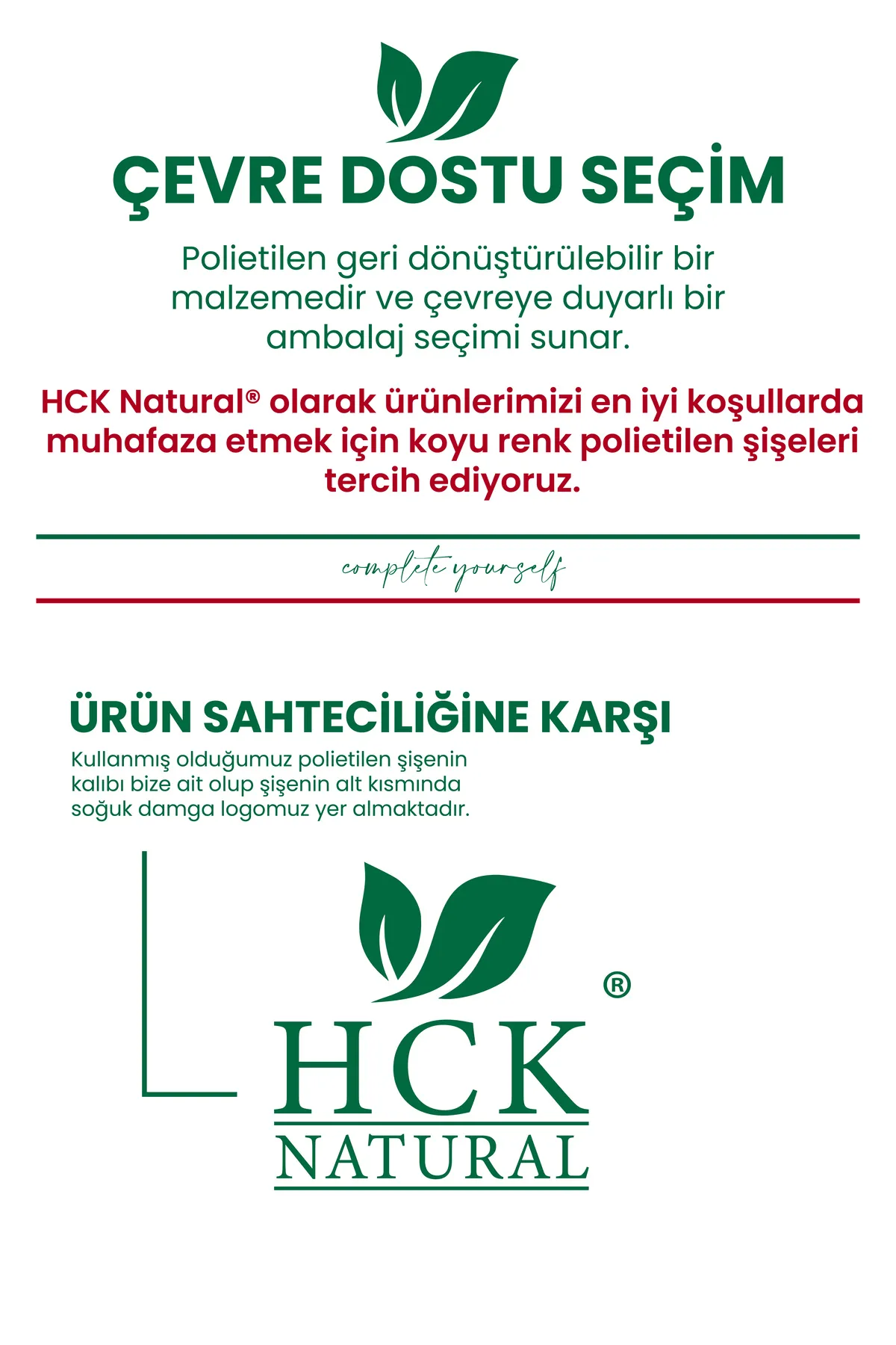 HCK Natural olarak ürünlerimizi en iyi koşullarda muhafaza etmek için koyu renk polietilen şişeleri tercih ediyoruz.