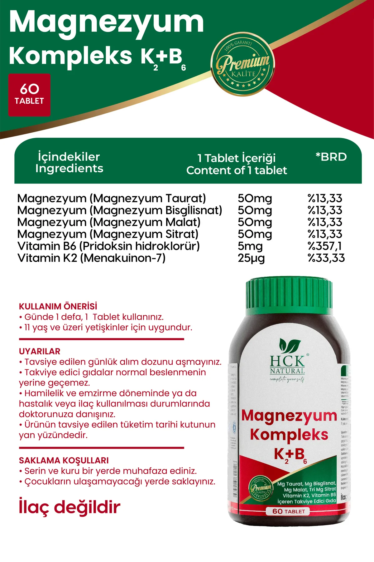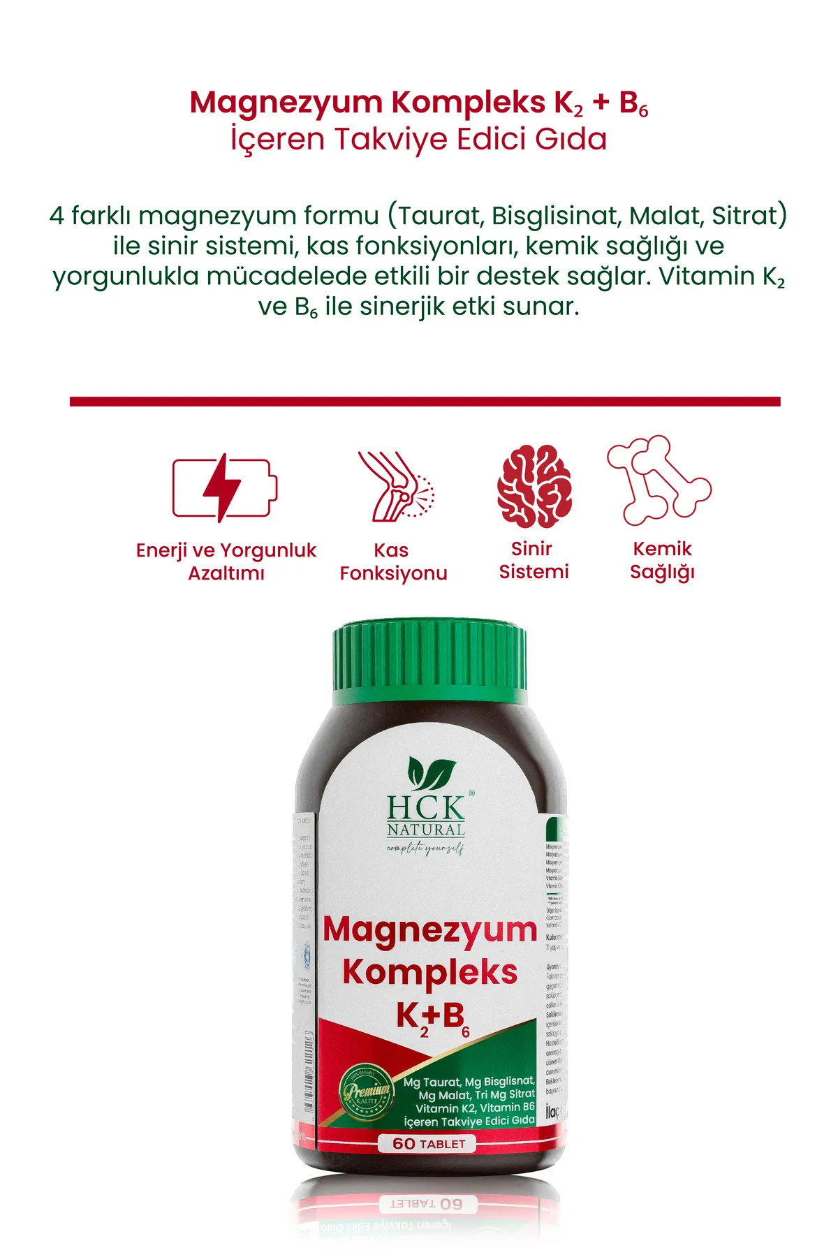 HCK Natural Magnezyum Kompleks K2 + B6, dört farklı magnezyum formu ile vücudunuzun günlük magnezyum ihtiyacını karşılar ve kas fonksiyonlarınızı destekler. İçerdiği Vitamin B6, enerji metabolizmasına katkıda bulunurken, Vitamin K2 kemik sağlığını destekleyerek magnezyumun etkisini artırır.
