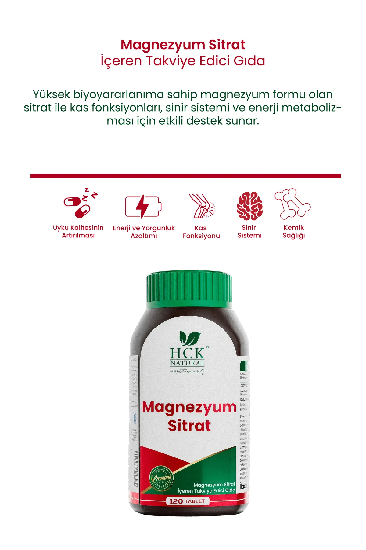HCK Natural Magnesium Citrate, vücudunuzun günlük magnezyum ihtiyacını karşılamak için özel olarak formüle edilmiştir. Kas ve sinir sistemi sağlığını destekleyen bu takviye, enerji üretimi, kemik sağlığı ve genel vücut fonksiyonları için kritik bir mineraldir. Magnezyum sitrat formu sayesinde kolay emilim sağlar ve hızlı etki gösterir.