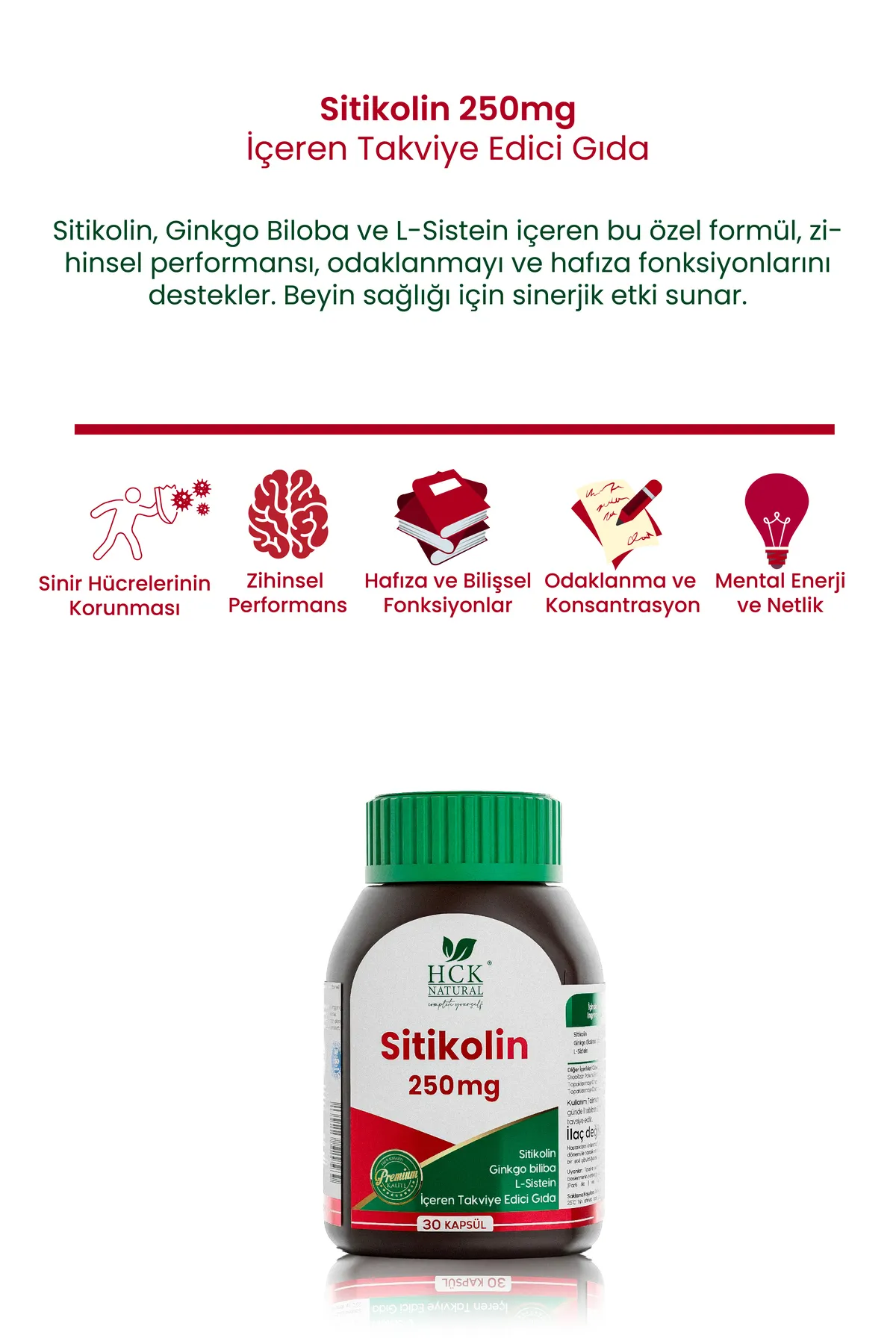 HCK Natural Sitikolin 250mg, yoğun mental aktiviteye ihtiyaç duyan kişiler için mükemmel bir destektir.