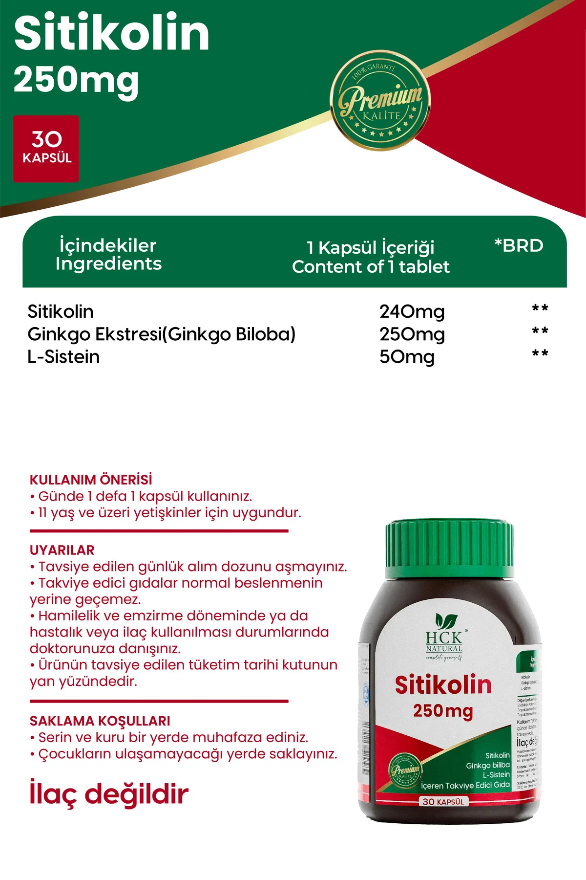 HCK Natural Sitikolin 250mg, beyin sağlığınızı destekleyen, zihinsel performansı artıran ve bilişsel fonksiyonları koruyan özel bir formül sunar. Sitikolin, hafızayı destekleyerek beyin sağlığına katkıda bulunurken, Ginkgo biloba bitkisi kan dolaşımını artırarak zihinsel keskinliği ve konsantrasyonu geliştirir. L-Sistein ise antioksidan etkisi ile hücreleri serbest radikallerin zararlarından korur.