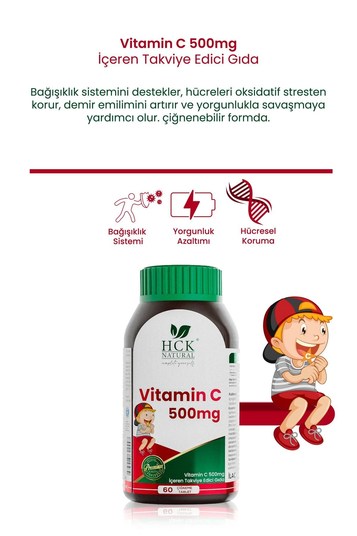HCK Natural Vitamin C 500 mg çiğneme tabletleri bağışıklık sisteminizi desteklemek için özel olarak formüle edilmiştir. Güçlü antioksidan özelliği sayesinde hücrelerin oksidatif stresten korunmasına yardımcı olur. Kolajen üretimini destekleyerek cildinizin esnek ve sağlıklı kalmasına katkıda bulunur. Çiğneme formunda olması sayesinde kolayca tüketilebilir ve lezzetlidir.