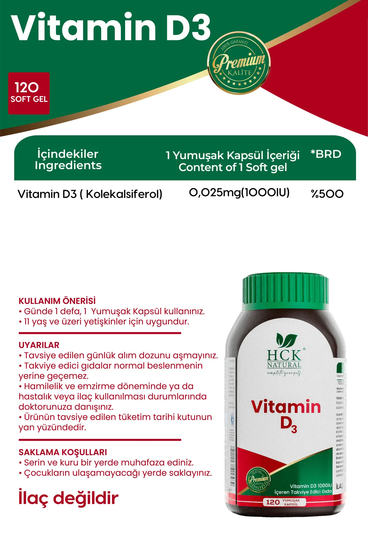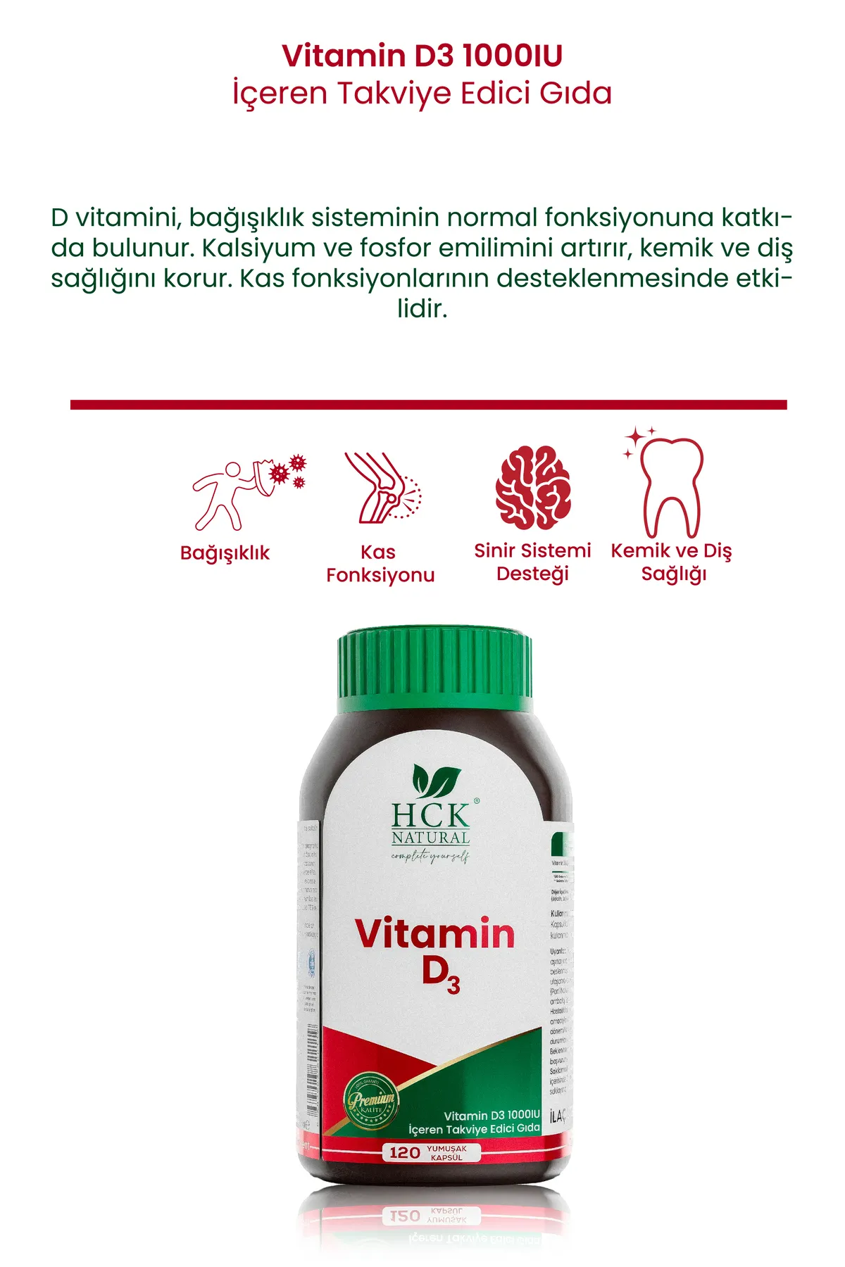 HCK Natural Vitamin D3 1000 IU, günlük D vitamini ihtiyacınızı karşılayarak kemik, diş ve bağışıklık sağlığınızı desteklemek için ideal bir formüldür. D3 vitamini, vücutta kalsiyumun emilimini artırarak kemiklerin güçlenmesine yardımcı olur ve bağışıklık sisteminin normal işleyişine katkıda bulunur.