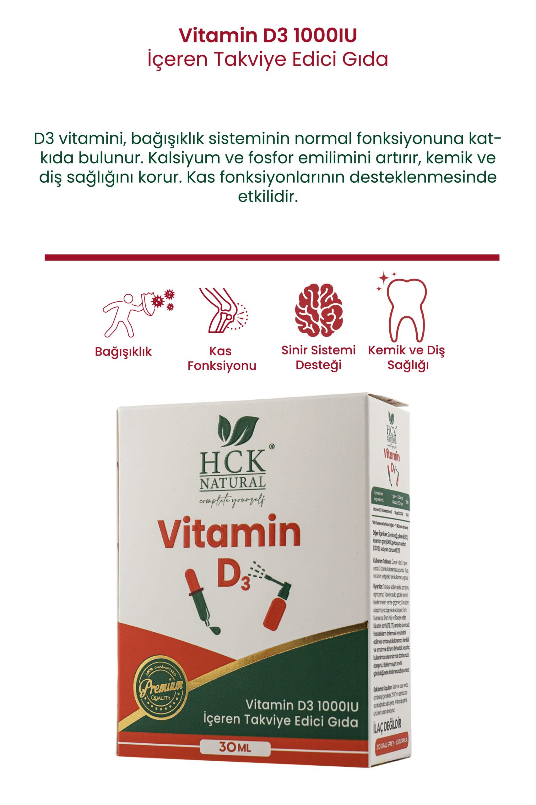 HCK Natural Vitamin D3 1000 IU, günlük D vitamini ihtiyacınızı karşılayarak kemik, diş ve bağışıklık sağlığınızı desteklemek için ideal bir formüldür. D3 vitamini, vücutta kalsiyumun emilimini artırarak kemiklerin güçlenmesine yardımcı olur ve bağışıklık sisteminin normal işleyişine katkıda bulunur.
