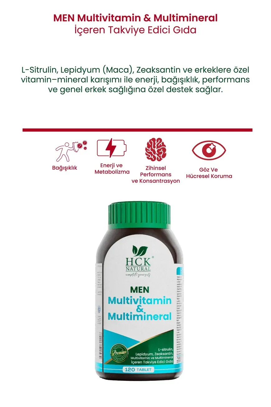 HCK Natural Men Multivitamin & Multimineral, erkeklerin günlük vitamin ve mineral ihtiyaçlarını karşılamak için formüle edilmiştir. İçeriğindeki L-sitrulin, Kore Ginsengi, Koenzim Q10 gibi özel bileşenler, enerji seviyelerini artırmaya, bağışıklık sistemini güçlendirmeye ve kas fonksiyonlarını desteklemeye yardımcı olur. Bu multivitamin, vücuda çok yönlü bir destek sunarak fiziksel ve zihinsel performansınızı artırmayı hedefler.